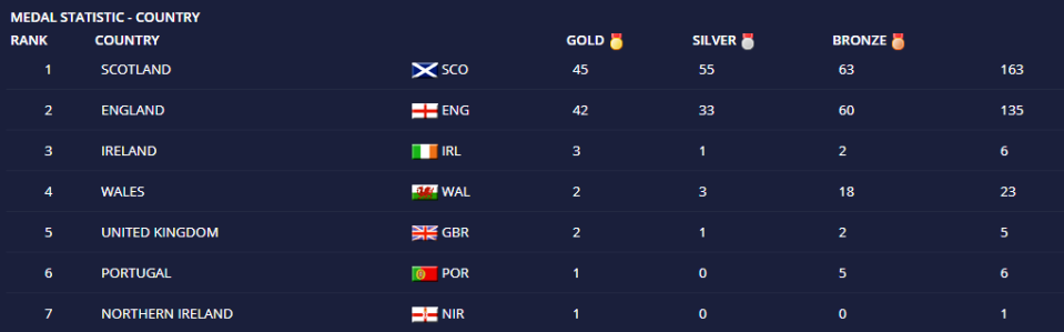 Top nation for this years tournament went to Scotland who won 45 Gold medals amassing a total of 163 medals. England were close behind on the Gold medal count winning 42 but way behind Scotland's 55 Silver medal count securing 33 which helped England secure a grand total of 135 medals. Third spot was claimed by Ireland ahead of Wales by a solitary Gold.
